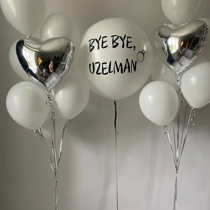 Набор из двух связок и большого латексного шара 24" с индивидуальной надписью. 14 простых шаров 12", 2 фольгированных сердца 18", 1 большой шар 24" с индивидуальной надписью 3 грузика. Цвета и надписи могут быть изменены.