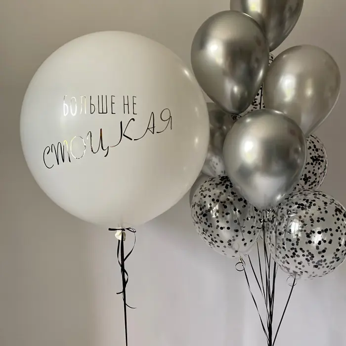 Набор из одной связки и большого латексного шара 36" с индивидуальной надписью. 6 шаров хром 12", 5 шаров с конфетти 12", 1 большой шар 36" с индивидуальной надписью 2 грузика. Цвета и надписи могут быть изменены.