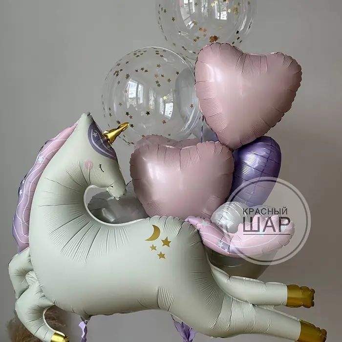 Набор из фигуры и пышного фонтана Состав: Фигура "Единорог" Фонтан: 8 фольгированных сердец 18" 2 шара-бабл с конфетти 2 грузика Цвета и фигура могут быть изменены.