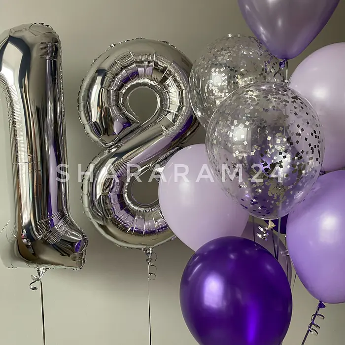 Набор из одной связки и 2 фольгированных цифр Состав: 7 простых шаров 12", 2 шара с конфетти 12", 2 фольгированные цифры, 3 грузик. Цвета могут быть изменены.