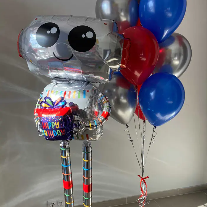 Набор из одной связки и ходячей фигуры. Состав: 6 простых шаров 12", 4 шара хром 12", 1 фольгированная ходячая фигура, 2 грузика. Цвета могут быть изменены.