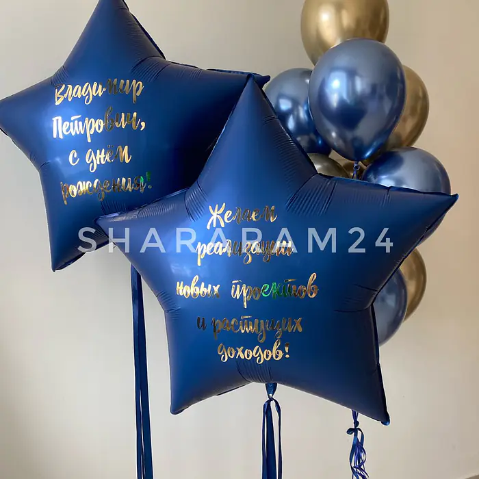 Набор из связки и 2 фольгированных звезд 36" с индивидуальной надписью. Состав: 10 шаров хром 12", 2 фольгированная звезда 36" с индивидуальной надписью, 2 грузик. Цвета и надпись могут быть изменены.