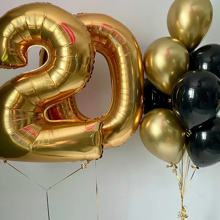Набор из одной связки и 2 фольгированных цифр. Состав: 5 простых шаров 12", 5 шаров хром 12", 2 фольгированный цифры "античное золото" 40", 2 грузика. Цвета, цифры могут быть изменены.