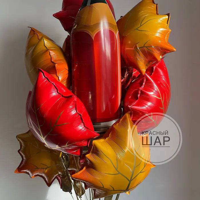 Набор фонтан из фольгированных фигур Состав: 10 фигур "Листья" Фигура "Карандаш" 1 грузик Цвета и фигуры могут быть изменены.