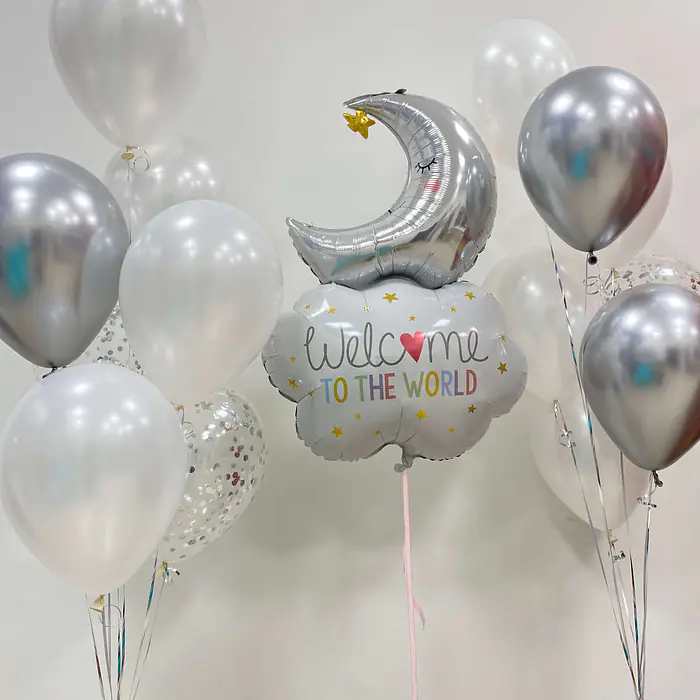 Набор из двух связок и фольгированной фигуры на грузиках. Состав: 8 простых шаров 3 шара с конфетти 3 шара хром 1 фольгированная фигура "Спящий месяц" Цвета могут быть изменены.