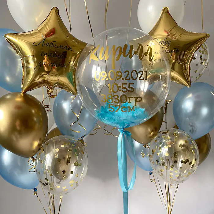 1 шар-бабл с перьями и индивидуальной надписью,