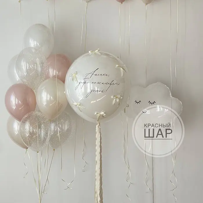 Набор из большого "стеклянного" шара с индивидуальной надписью и бантиками, фонтана, фигуры и шаров под потолок
