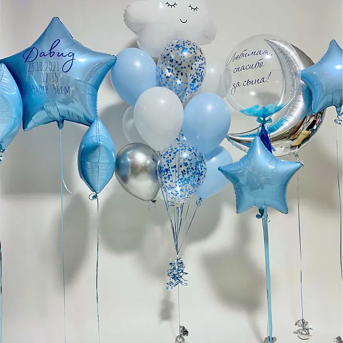1 месяца, 4 фольгированных звезд 18" и шара-бабл с перьями